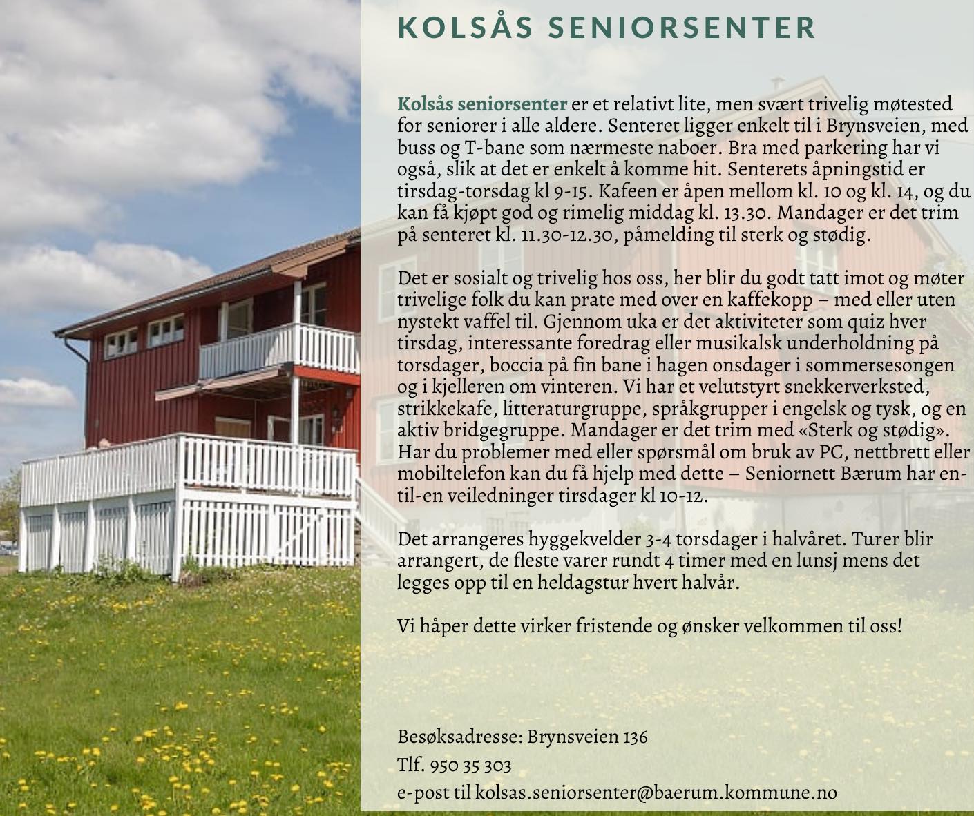 Kolsås Vel representerer om lag 10 000 innbyggere og omfatter etablerte boligområder som Lensmannsjordet, Løkenhavna, Løkenlia, Kolsåslia og Haugergrenda, samt områdene langs Kolsåsbanen på tidligere gårdsgrunn fra Hauger, Kolsberg, Rud og Løken.